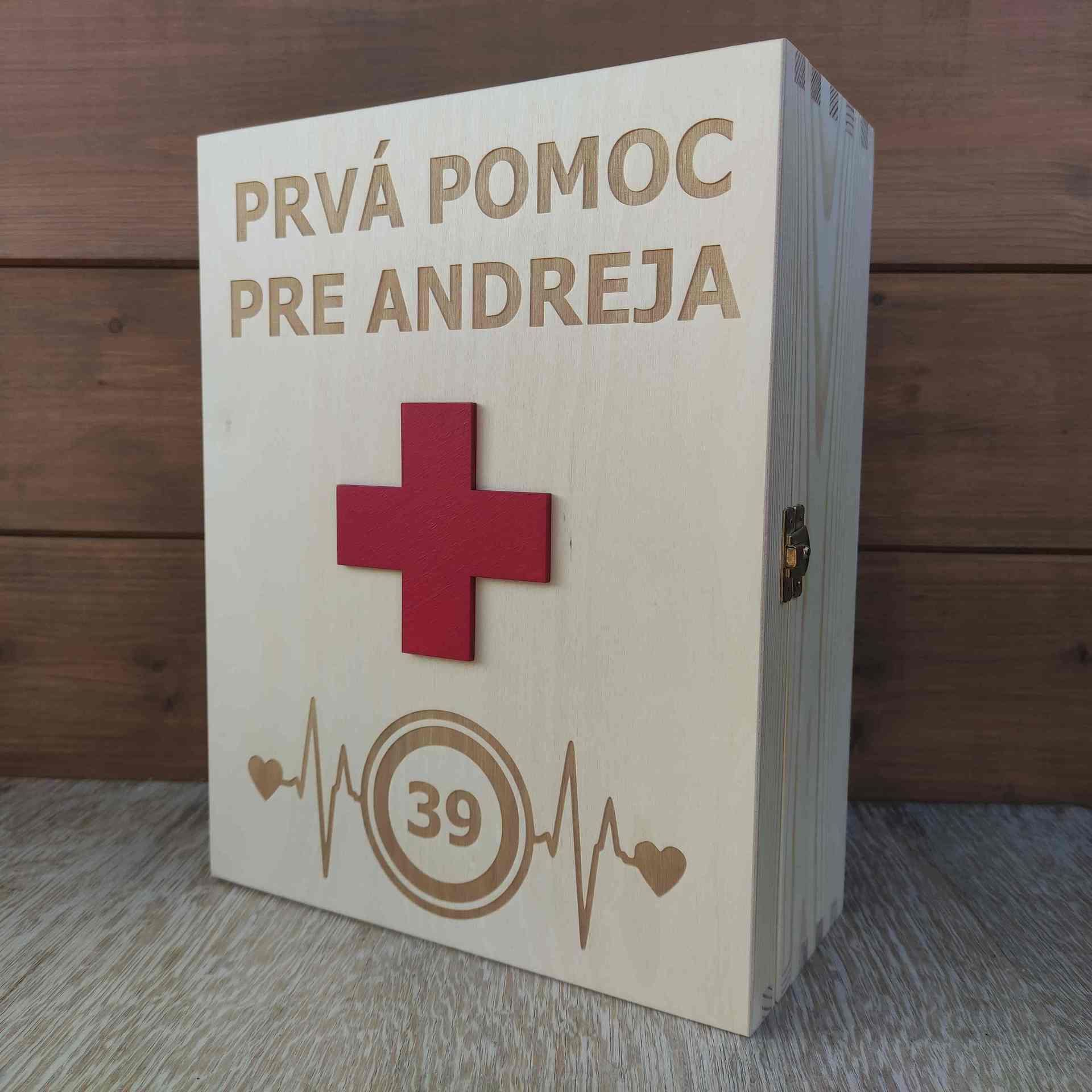 Vtipná krabička prvej pomoci - napodobenina lekárničky - v podobe dreveného boxu s personalizovaným textom ako skvelý darček pre muža či ženu.