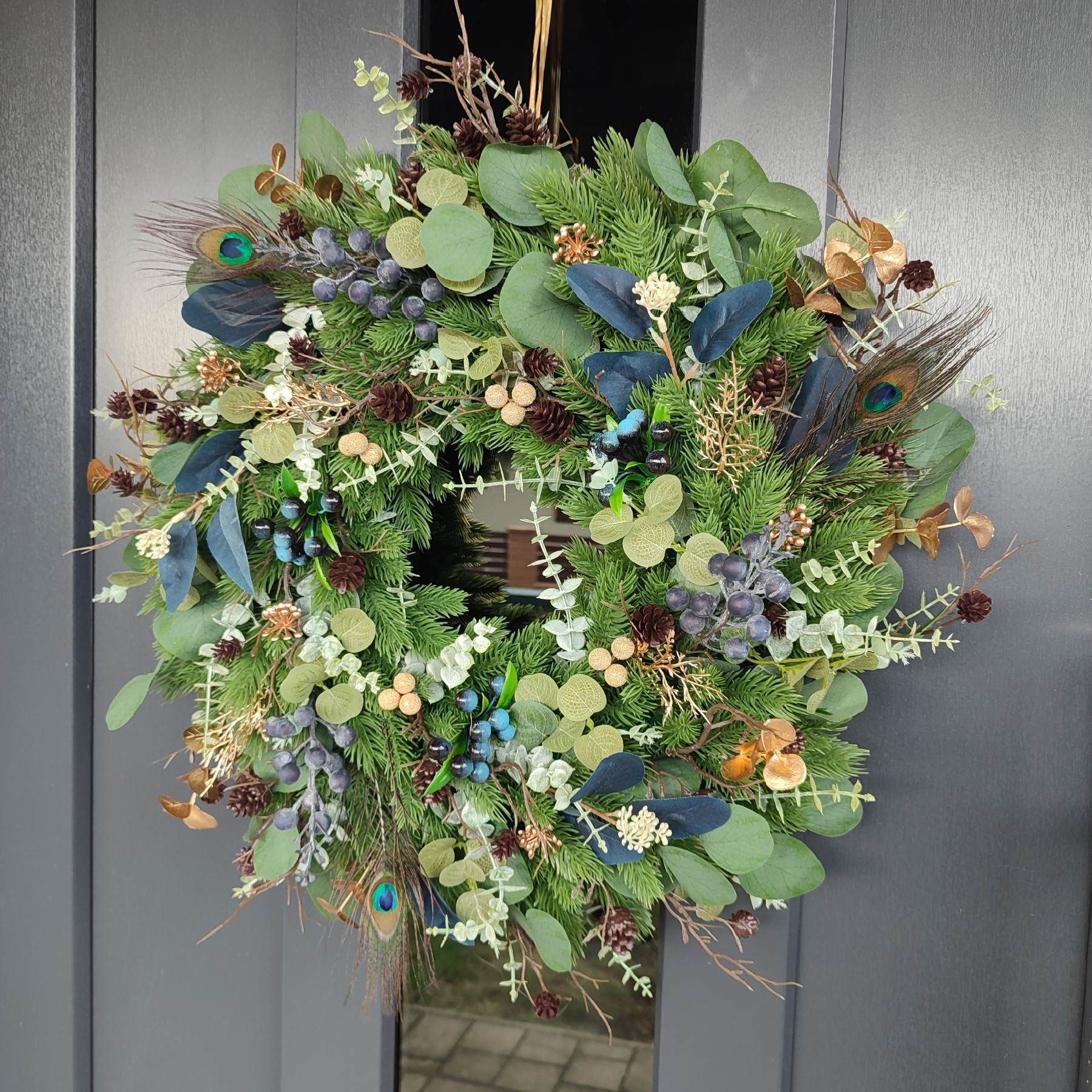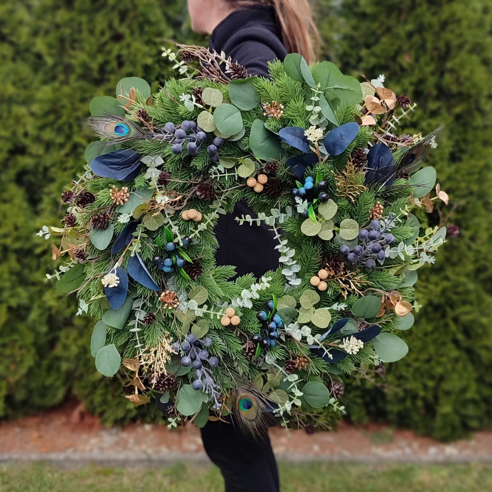 Veniec je tvorený umelým ihličím, eukalyptom, šiškami, konárikmi, bobuľkami, zlatými doplnkami a pávím perím, ktoré mu dodávajú nádych luxusu.