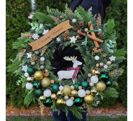 Ponúkame Vám veľký umelý čečinový veniec s jelenčekom. Veniec je doplnený množstvom ozdôb (gule, drevený nápis, škorica, šišky, hviezdičky...)