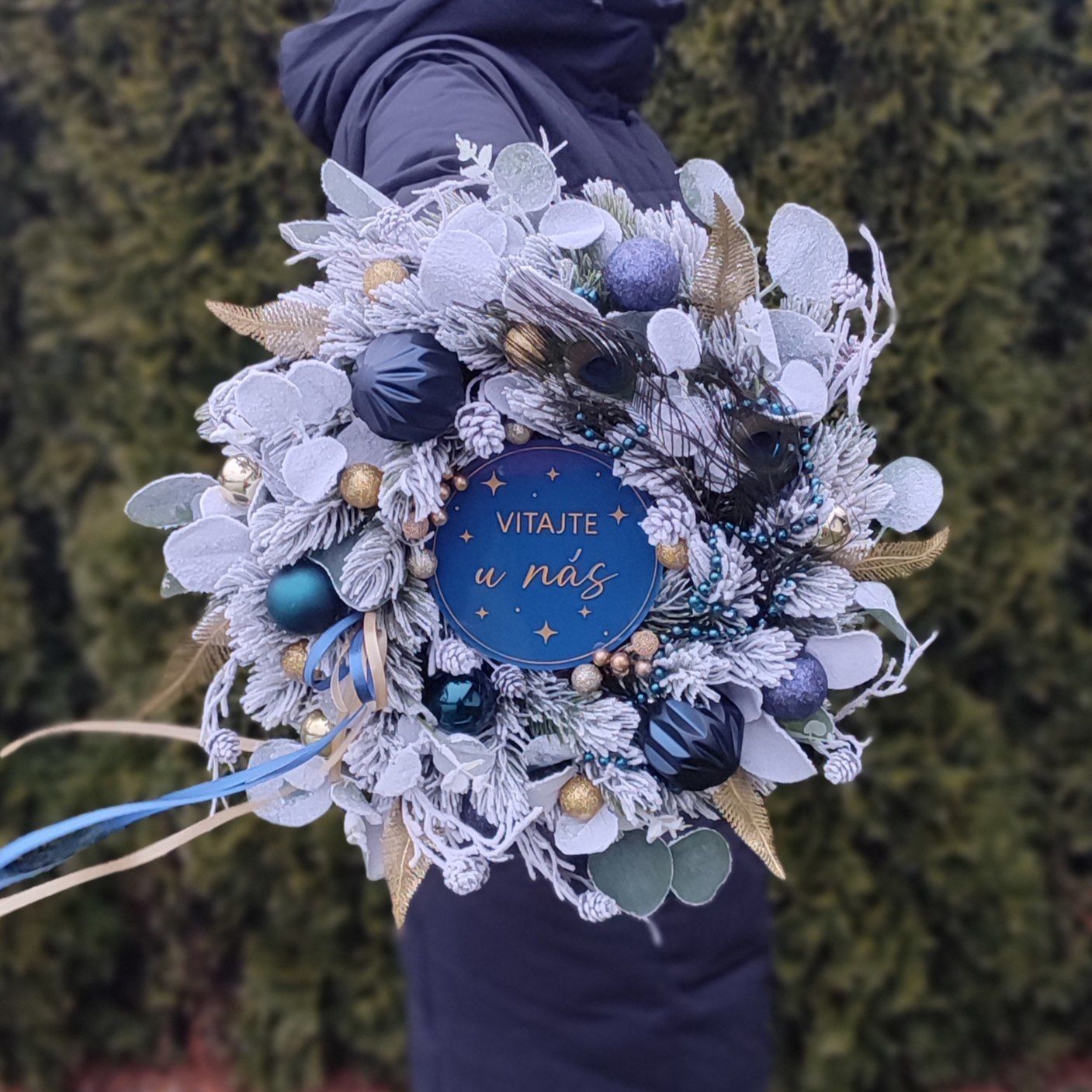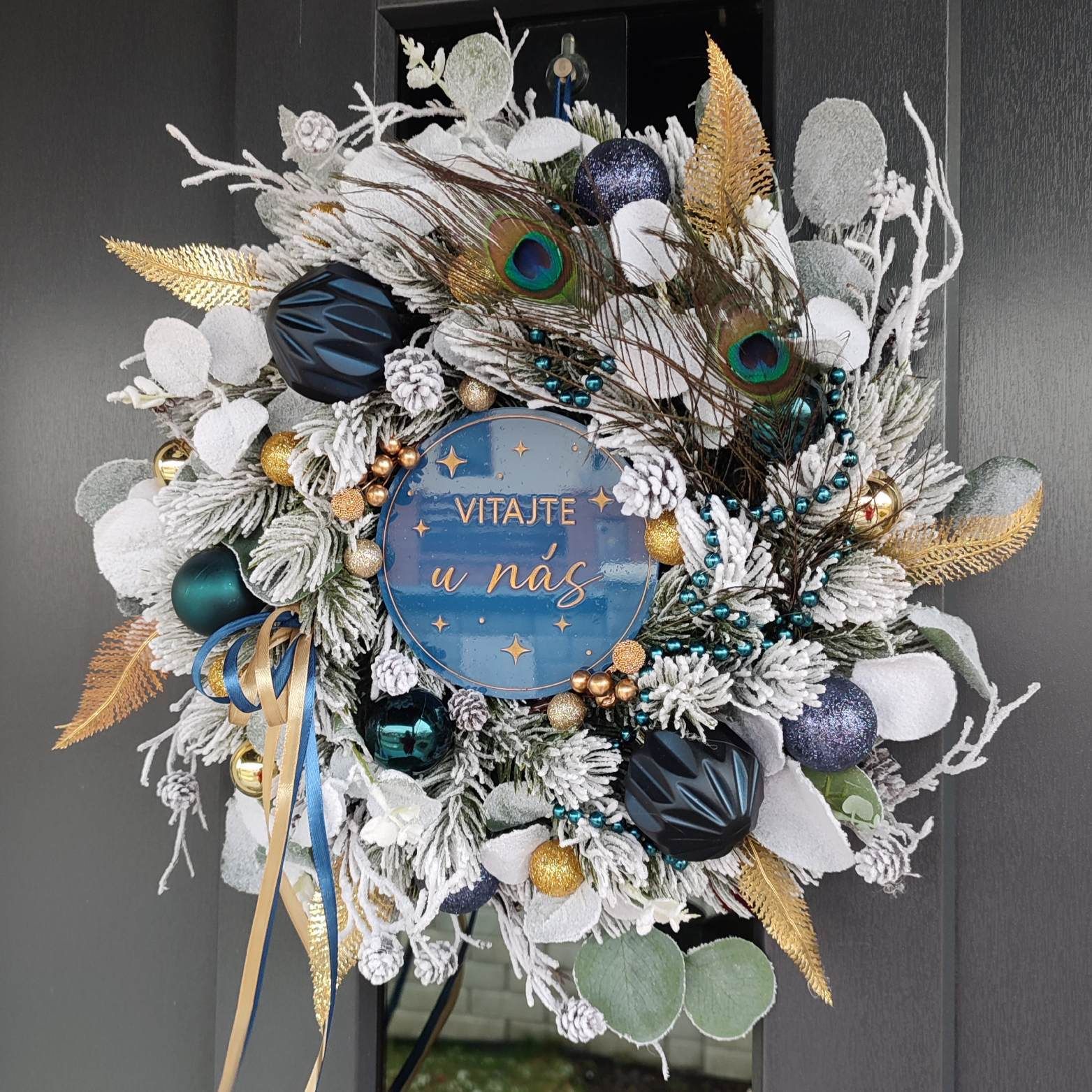 Luxusný zimný veniec v kombinácii modrých, zlatých a zasnežených prvkov pôsobí mimoriadne štýlovo a moderne. Dominantou venca je originálna tabuľka "Vitajte u nás", ktorá vencu dodáva osobitý charakter. Veniec je doplnený o pávie pierka, lesklé aj matné ozdoby, zlaté lístky a bohaté zasnežené vetvičký, vďaka čomu pôsobí honosne a exkluzívne.