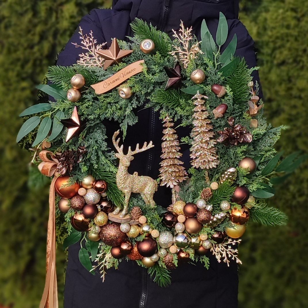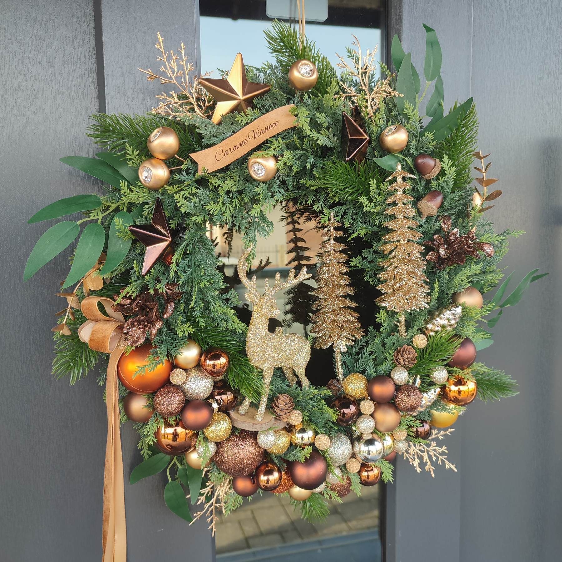 Vianočný veniec s jeleňom v zlatej a hnedej farbe