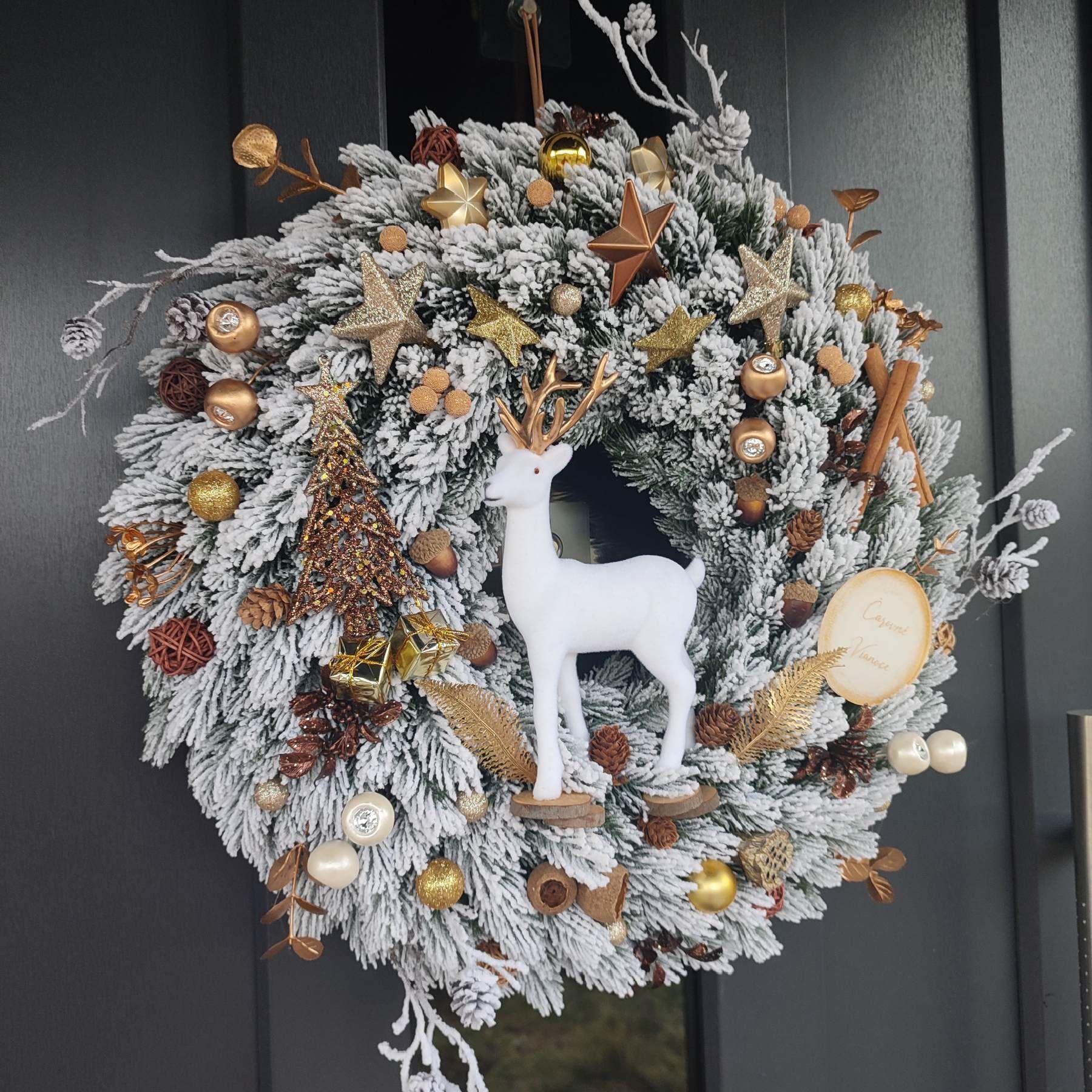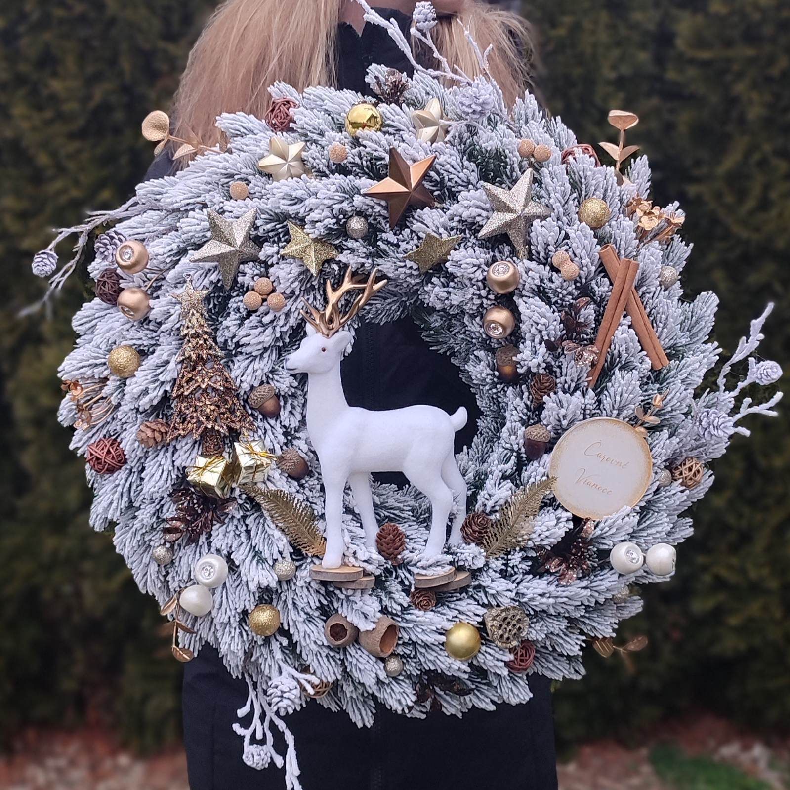 Veniec je mohutný, hustý - bohato zdobený guličkami, hviezdami, trblietavým stromčekom s darčekmi, prírodnými šiškami, škoricou a jemnými detailami v prírodných tónoch. Dominantou je biely jeleň, ktorý celému vencu dodáva magický zimný nádych.