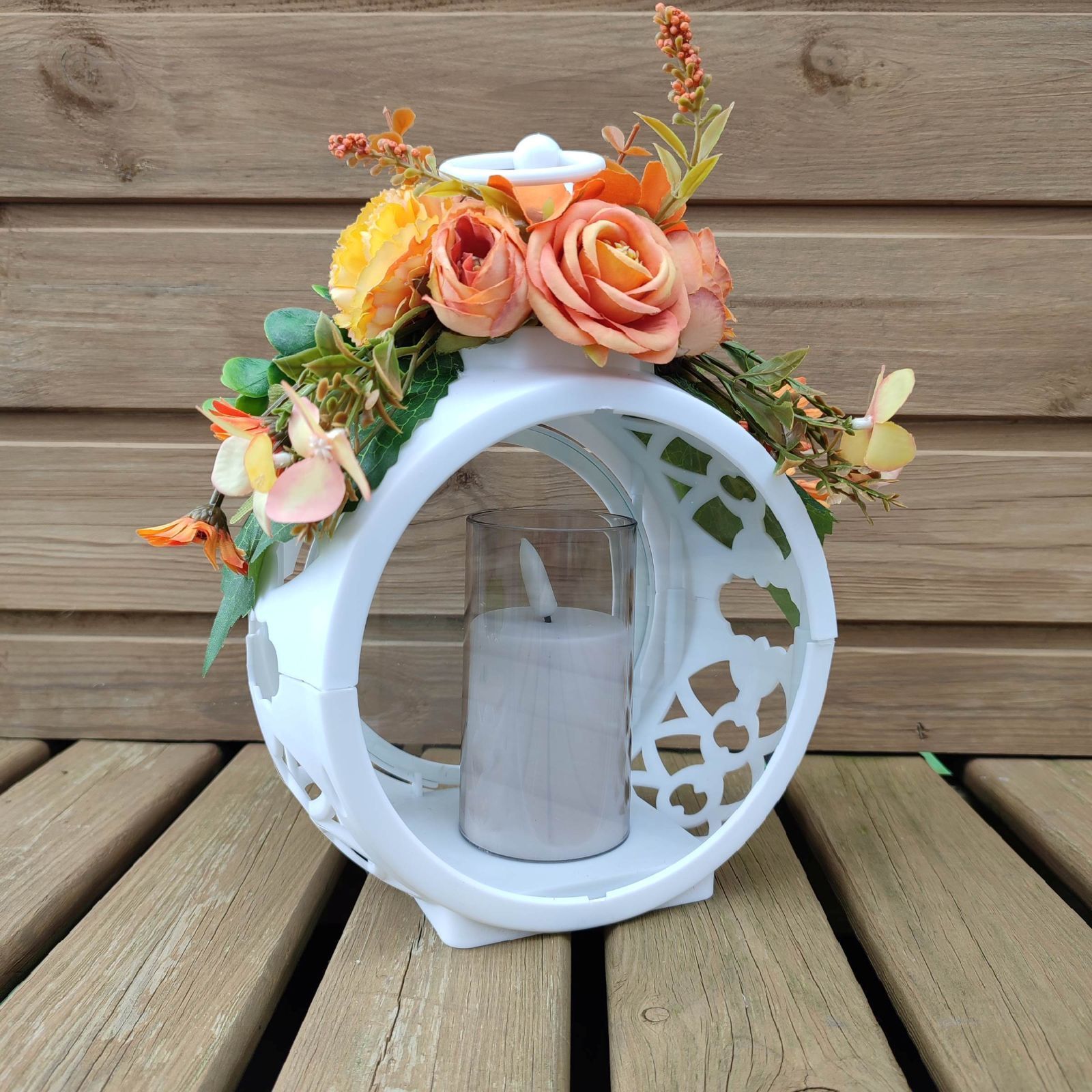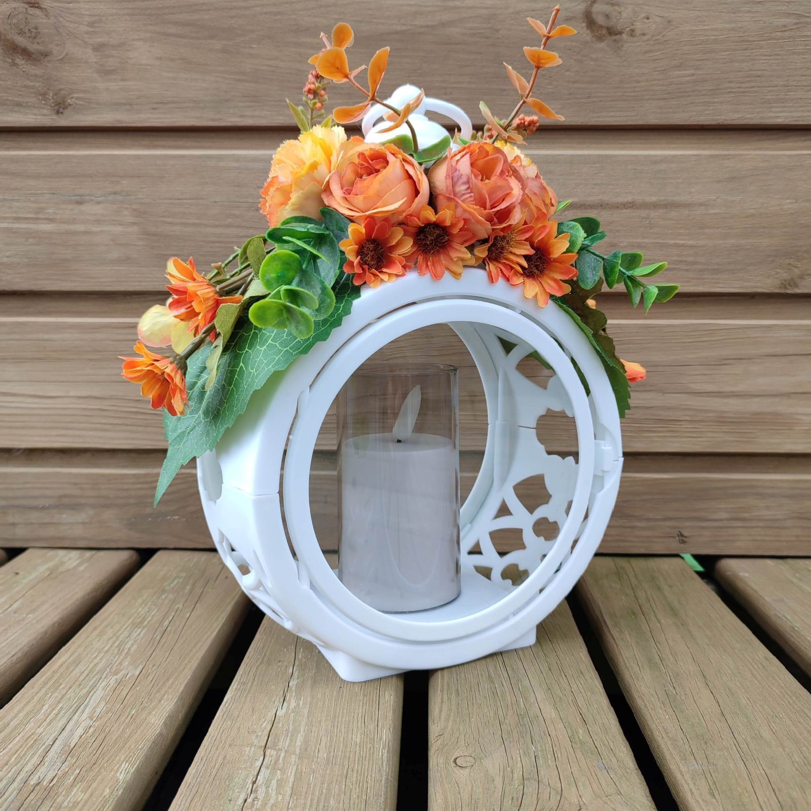 Elegantný biely spomienkový lampáš zdobený v oranžových tónoch je dôstojnou dekoráciou na hrob počas celého roka.