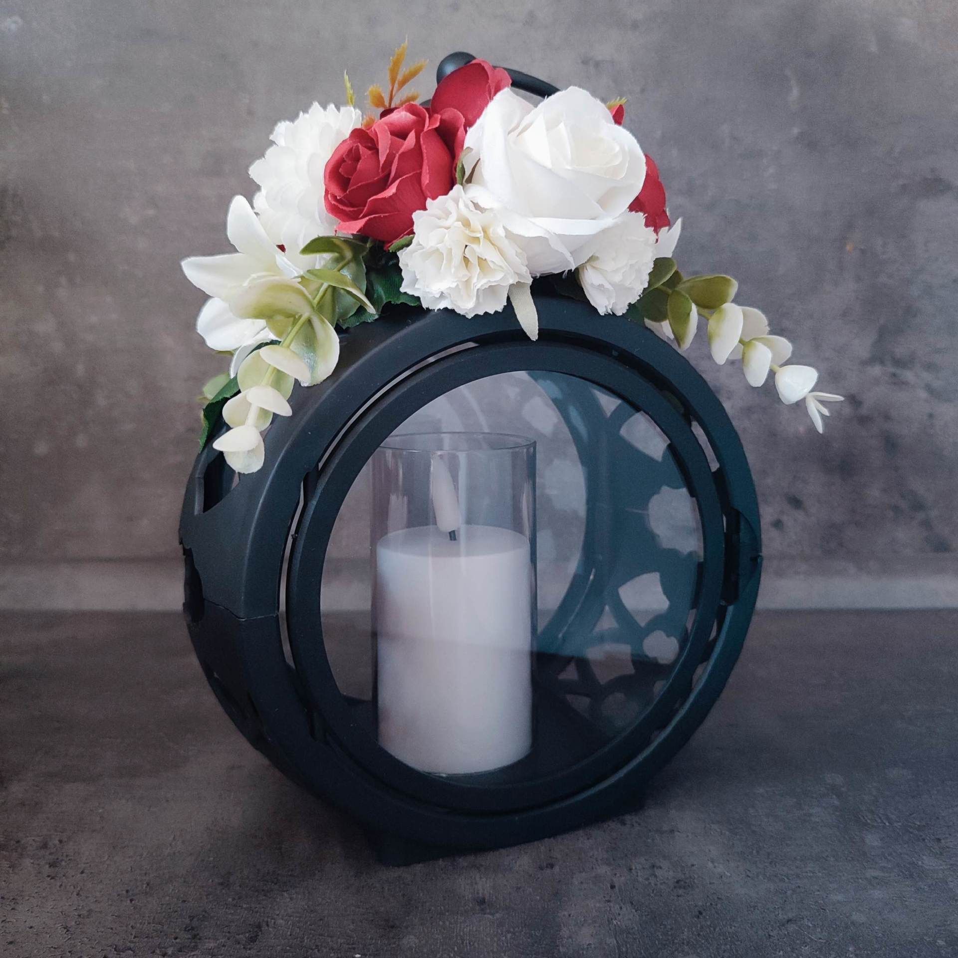 Elegantný čierny smútočný lampáš zdobený v bielo-červenej farbe je dôstojnou dekoráciou na hrob počas celého roka.