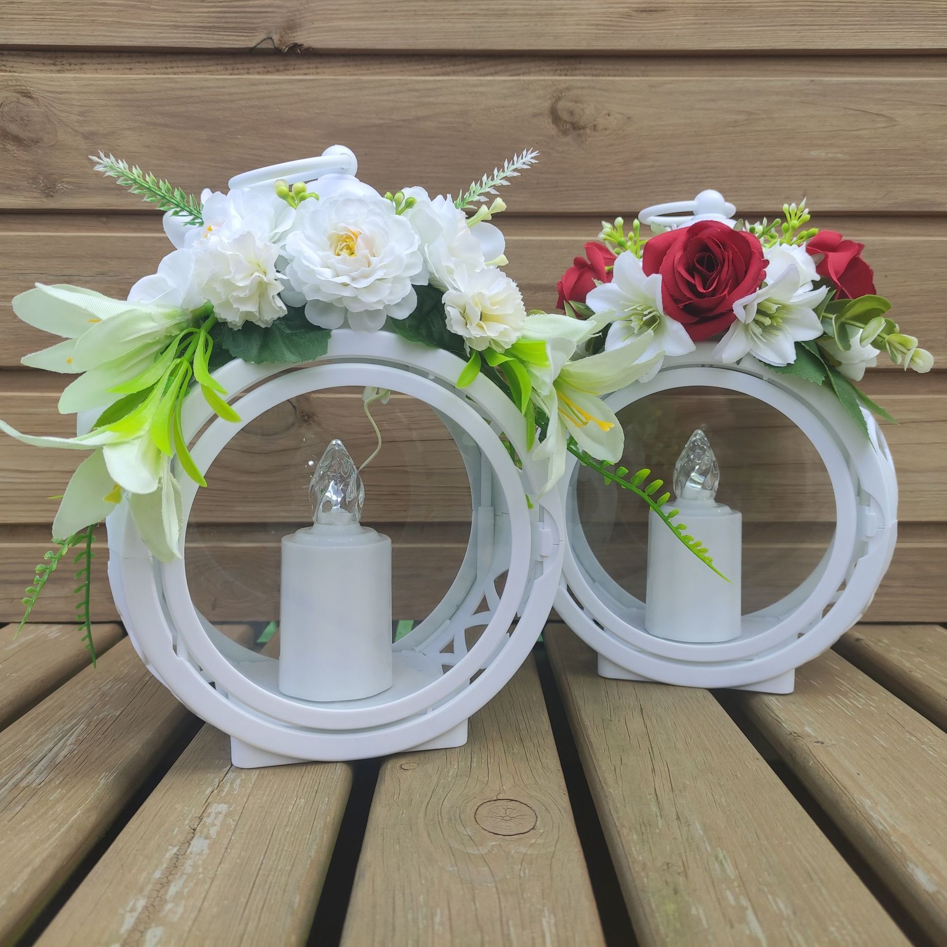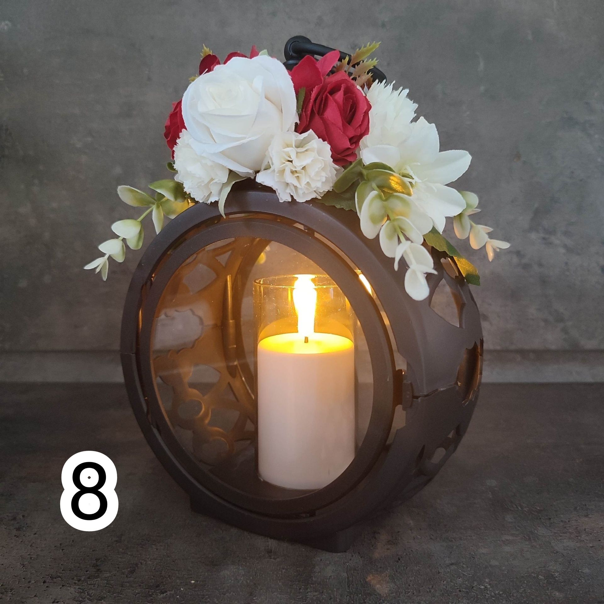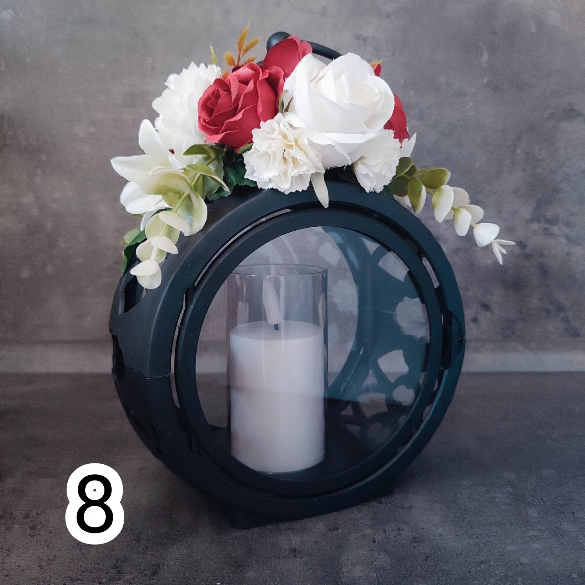 Okrúhly lampášik s dvierkami je zvrchu dozdobený umelou zeleňou a kvetmi. Je tak krásnou dekoráciou na hrob.