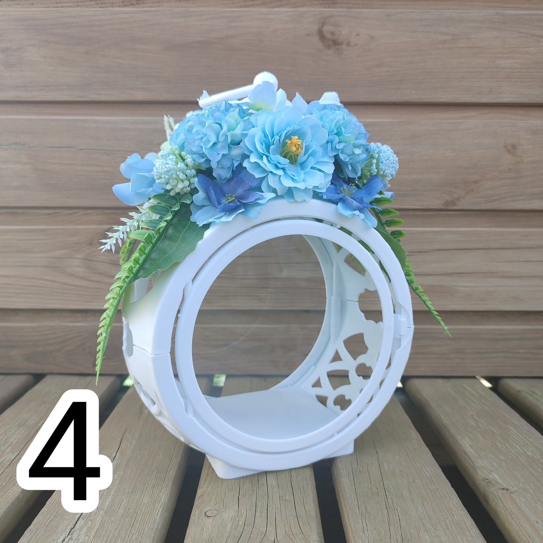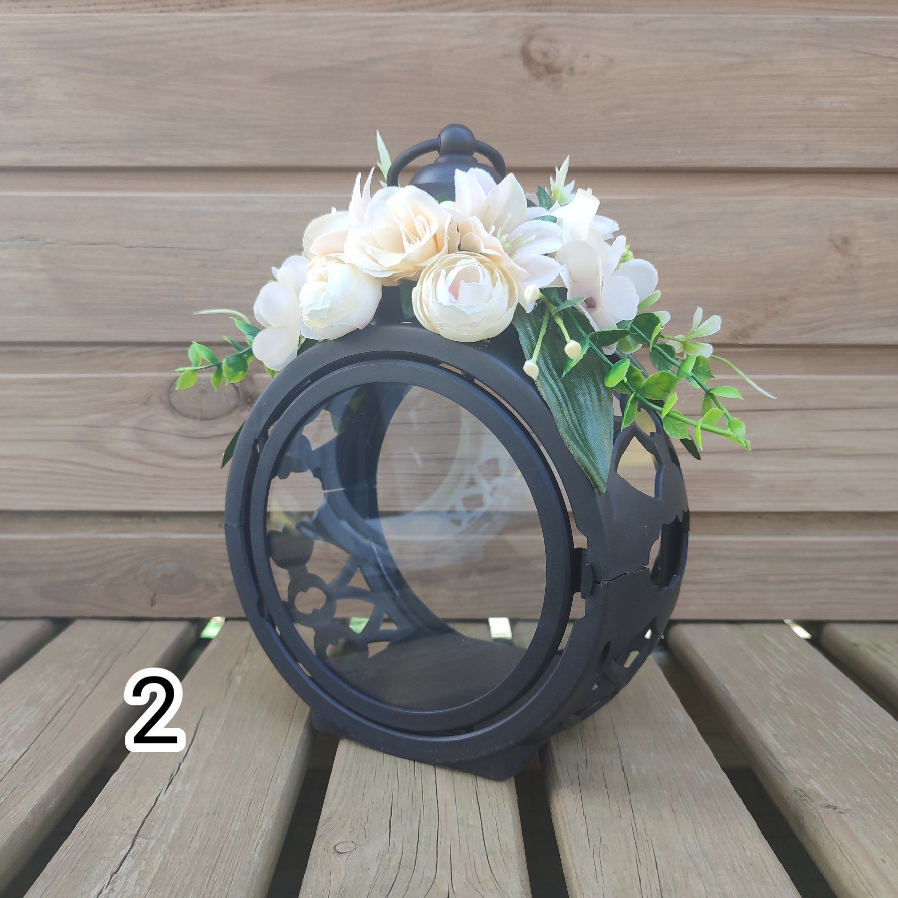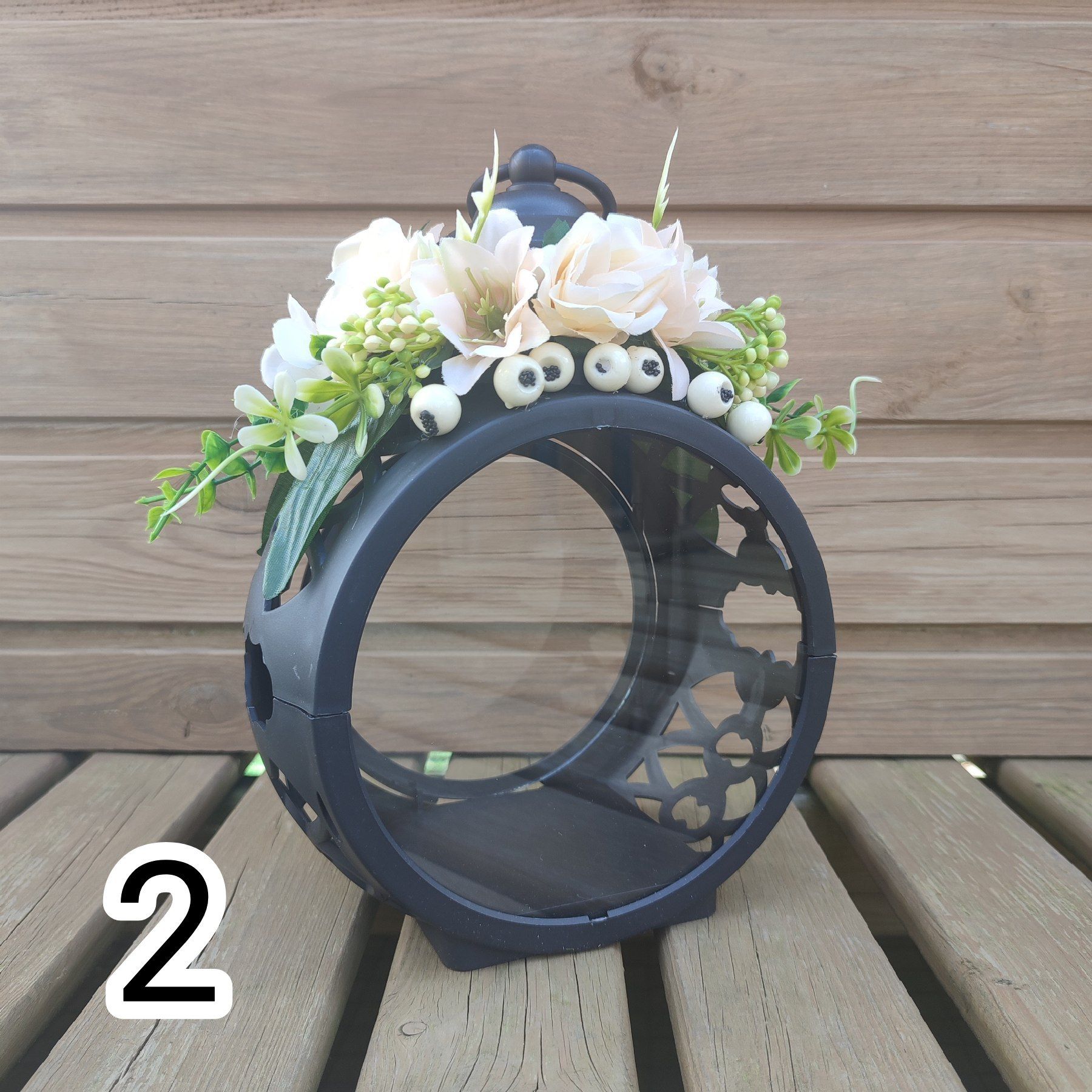Okrúhly lampášik s dvierkami je zvrchu dozdobený umelou zeleňou a kvetmi. Je tak krásnou dekoráciou na hrob.
