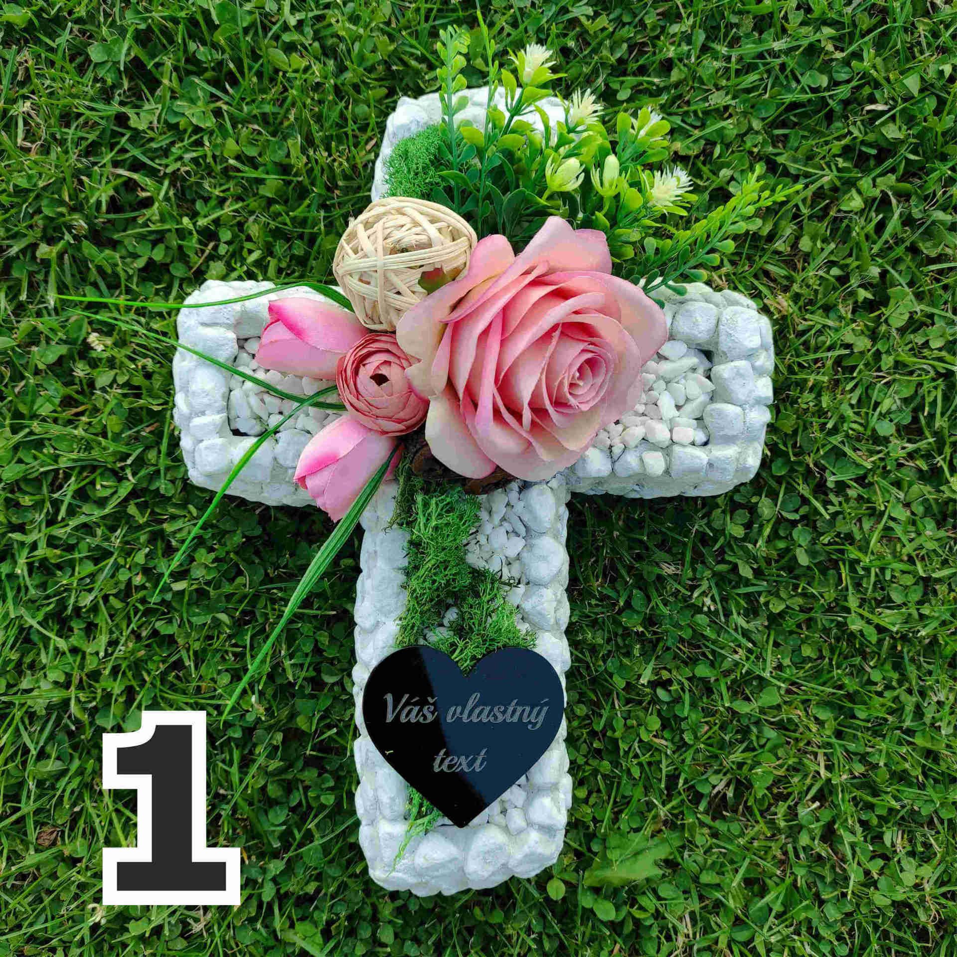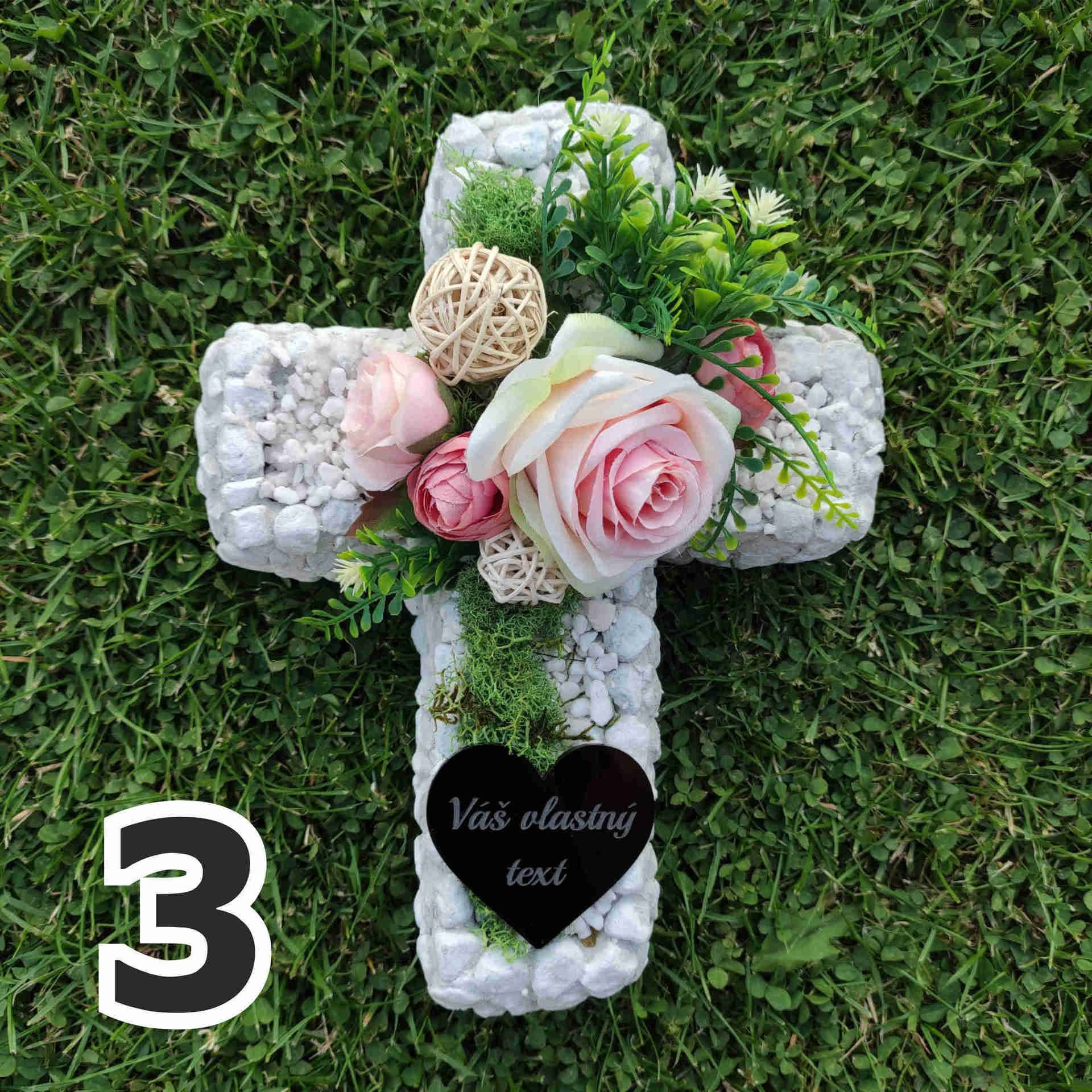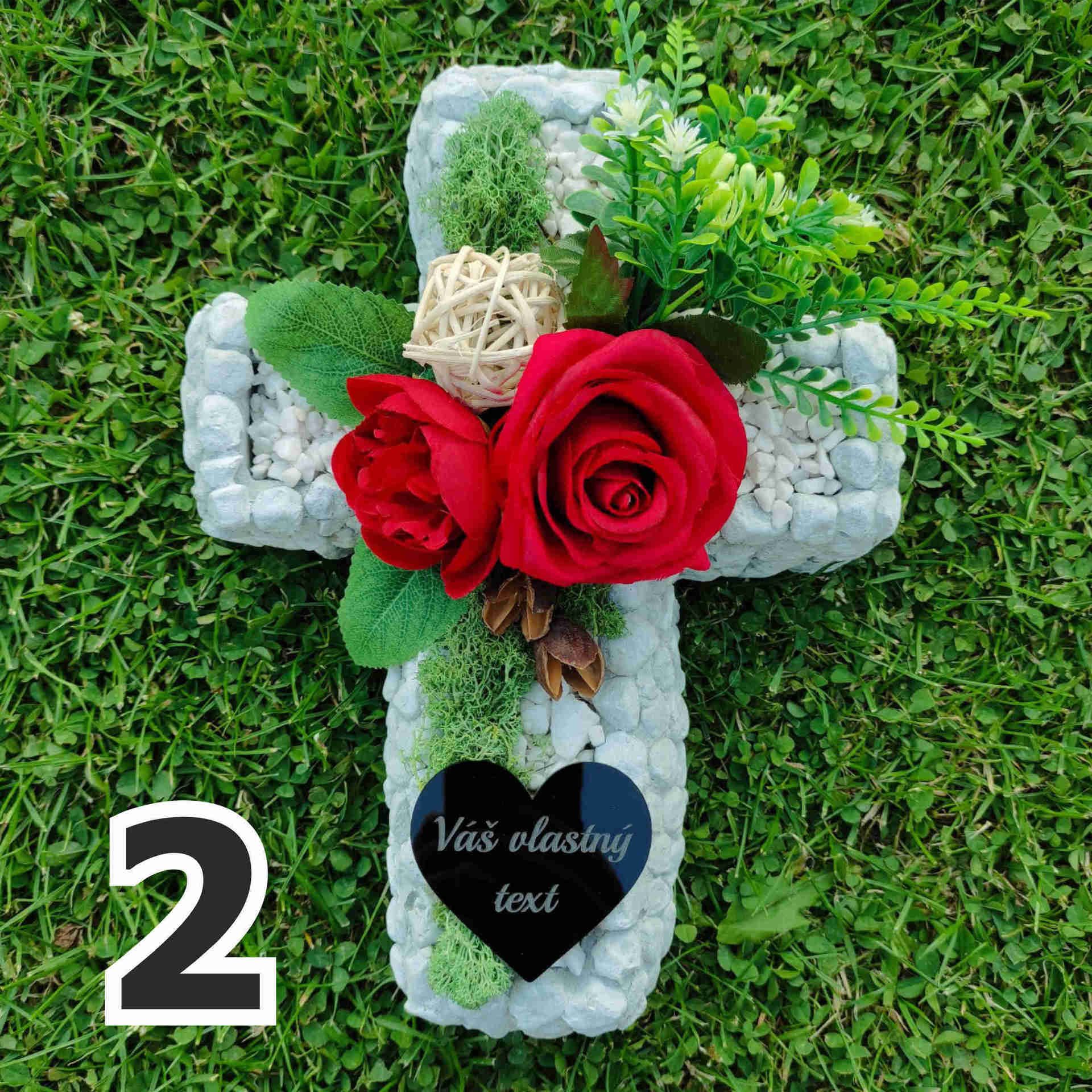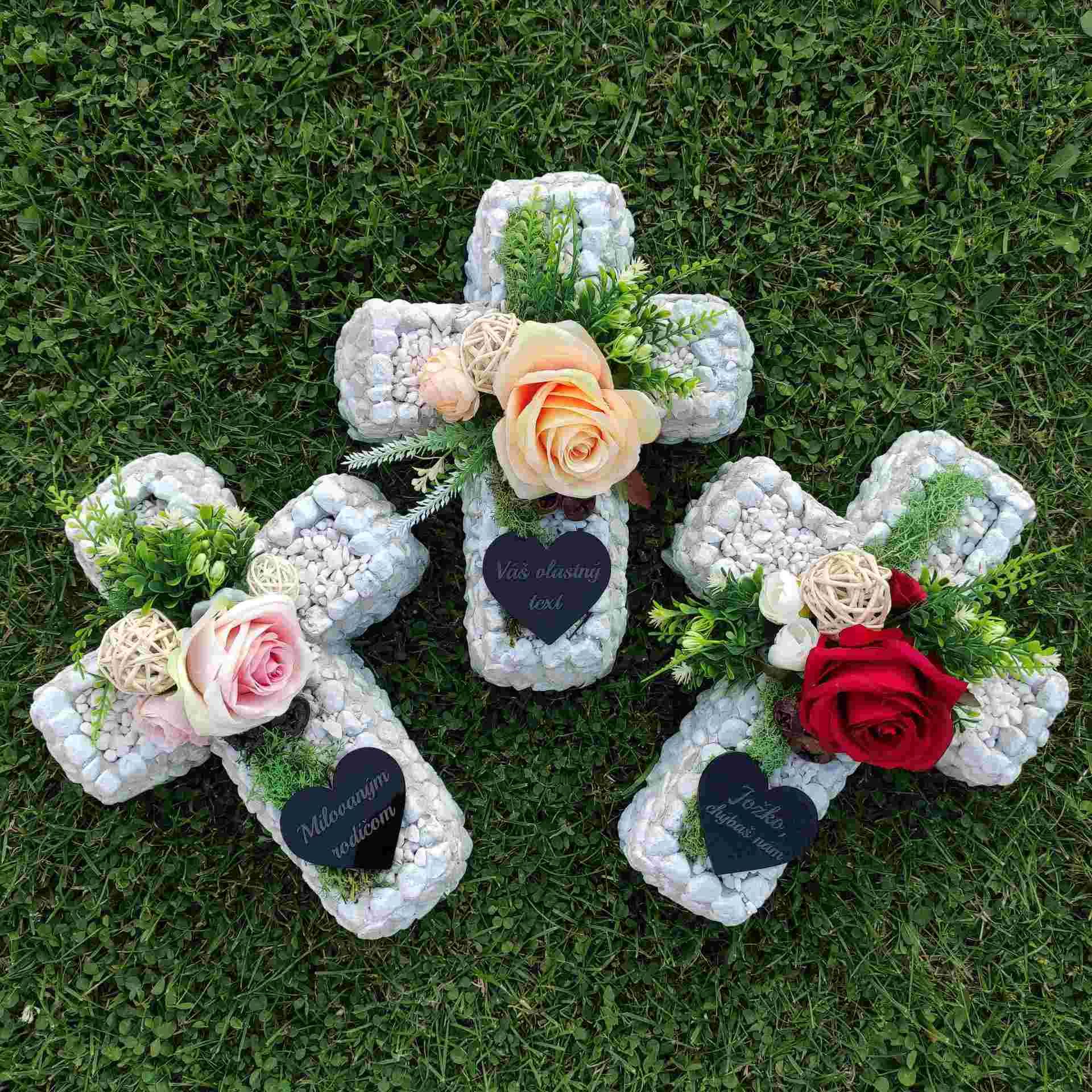 Betónový, kamienkový kríž je dozdobený umelým a prírodným materiálom a srdiečkom s textom podľa želania.
