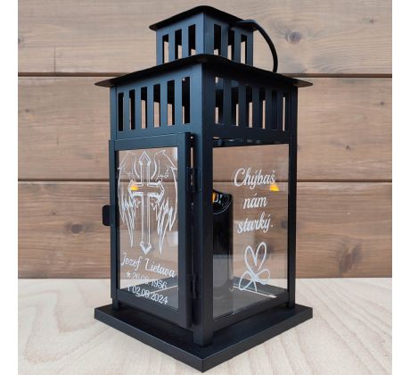 Kovový čierny lampáš je vhodný do interiéru aj exteriéru. Na sklo vygravírujeme krátky text / fotku podľa vašich požiadaviek - predné dvierkové sklo (text) a bočné sklá (text alebo fotografia). Prosím vyberte si z variant, či chcete gravírovať 2 alebo 3 sklá a či si želáte gravírovať texty alebo aj fotku.