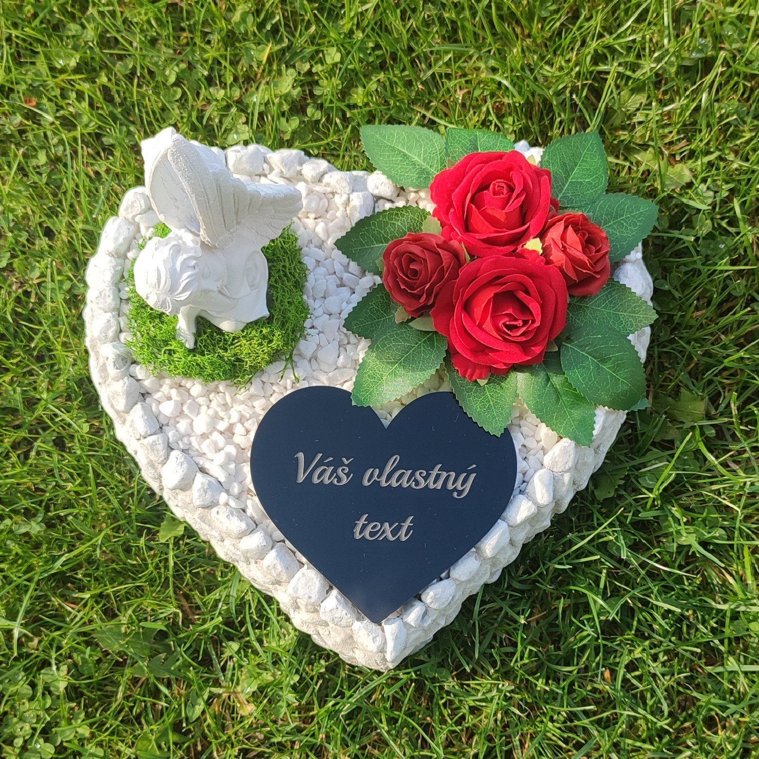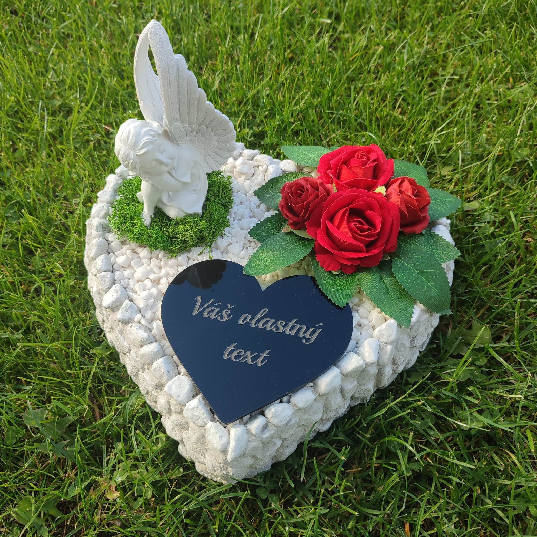 Srdce na hrob s anjelom a ružami - spomienková dekorácia s vlastným textom