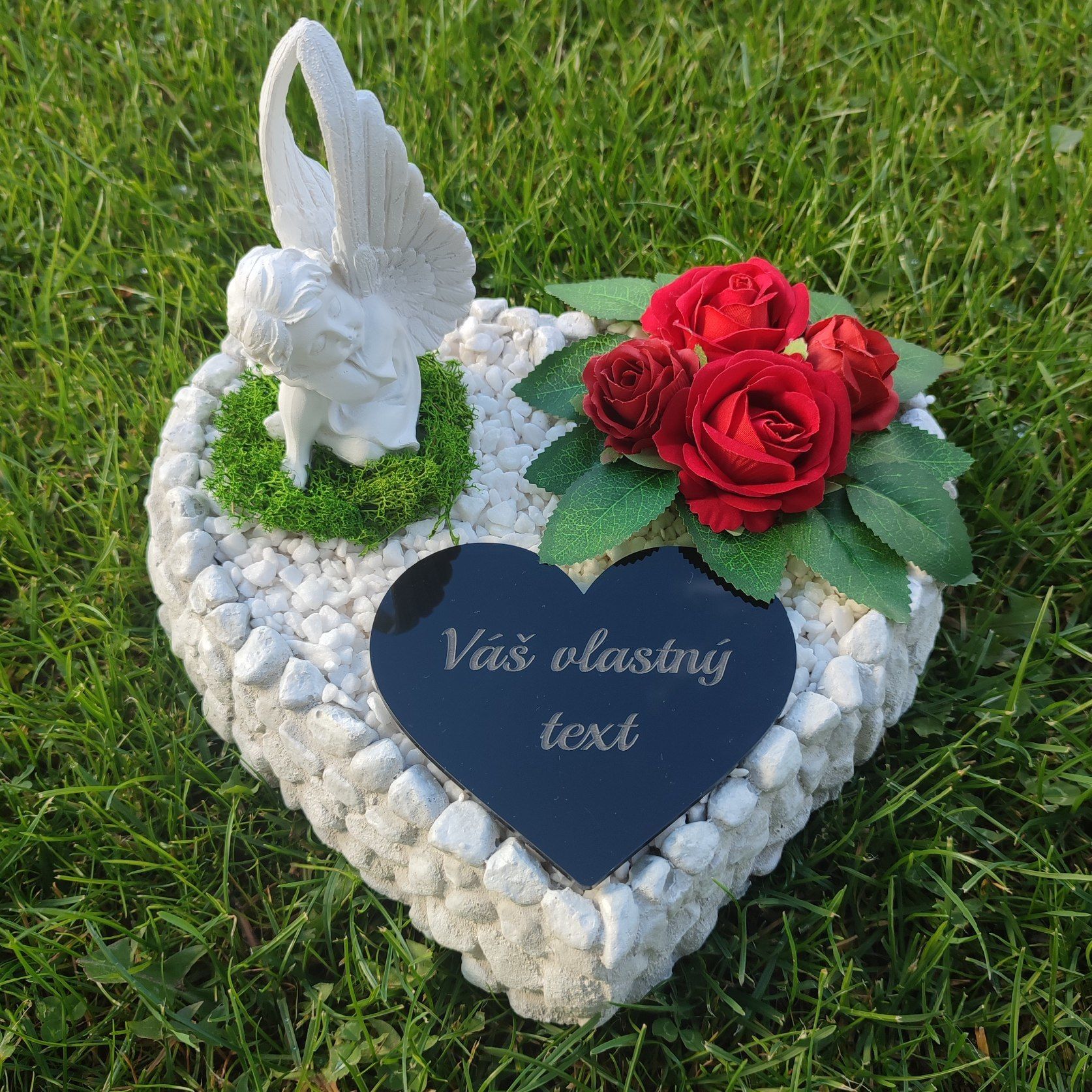 Aranžmán je zdobený anjelom, červenými ružami a zeleným machom. Na čierne akrylové srdce je možné vygravírovať Váš vlastný text