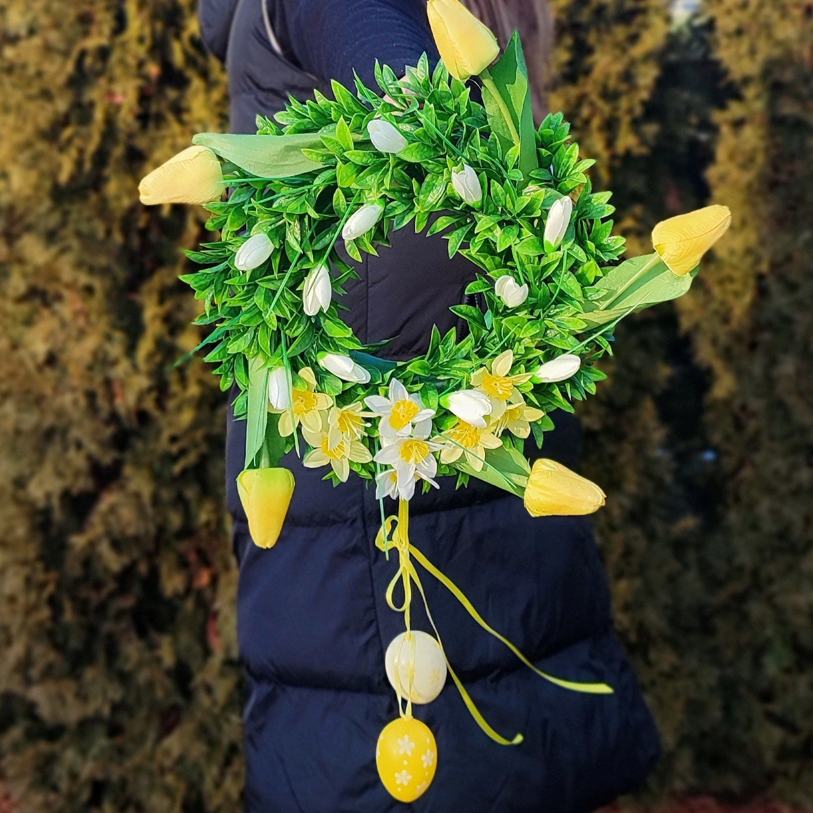 Jarný venček je na plastovom základe, doplnený typickými jarnými kvietkami ako sú tulipány, krokusy, narcisy. Krásna zeleno-žlto-biela kombinácia rozžiari každé dvere či stenu... Súčasťou venca sú vajíčka, ktoré sa z neho dajú dať dole, a tak ho využijete celé jarné obdobie.